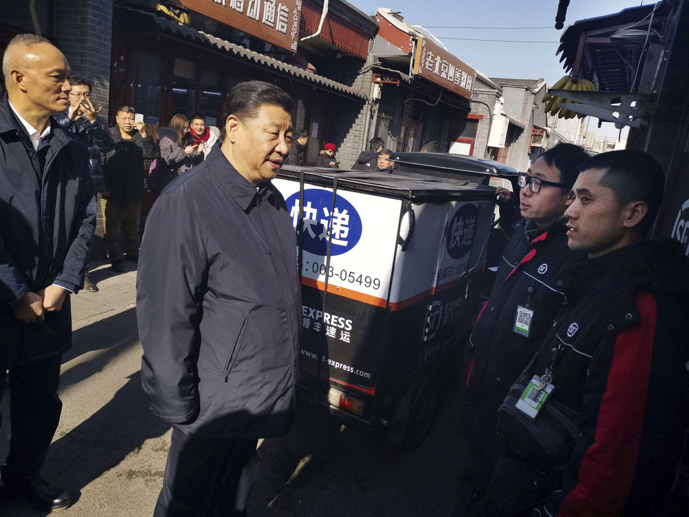 ↑2019年2月1日,習近平在北京看望慰問基層干部群眾,考察北京冬奧會、冬殘奧會籌辦工作。這是習近平在結束前門東區看望慰問乘車返回途中,臨時下車來到前門石頭胡同的快遞服務點,看望仍在工作的“快遞小哥”。