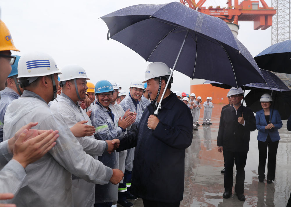 ↑2018年6月13日下午,習近平在山東中集來福士海洋工程有限公司煙臺基地,冒雨察看海洋工程設備建設場地,并同現場的工人們親切握手。
