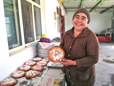 新疆哈密市伊吾縣下馬崖鄉八一小區的賽旦木·麥麥提看到高速公路開通后的發展勢頭,和兩個姐妹合伙建起了打馕合作社,每人每月都有2000多元的收入。本報記者 王瑟攝/光明圖片