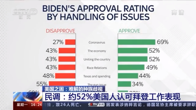 當(dāng)?shù)貢r(shí)間4月28日,美國(guó)總統(tǒng)拜登在國(guó)會(huì)山發(fā)表就職百日演說。據(jù)美國(guó)有線電視新聞網(wǎng)的民調(diào)統(tǒng)計(jì),在拜登就任總統(tǒng)滿100天之際,約52%的美國(guó)人認(rèn)可拜登的整體工作表現(xiàn),這一成績(jī)僅好于其前任特朗普,但卻低于自1953年的全部其他美國(guó)總統(tǒng)。
