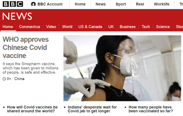英國廣播公司(BBC)報道稱,世界衛生組織周五表示,它已驗證了國藥疫苗的“安全性、有效性和質量”。這是第一款得到世衛組織支持的非西方國家研制的新冠疫苗。中國和其他一些國家已經有數千萬人接種了國藥疫苗。