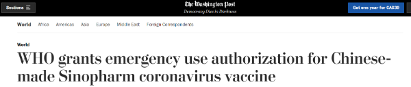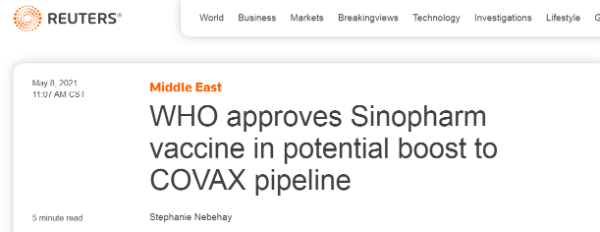 英國路透社報道認為,世界衛生組織周五批準中國國有制藥企業國藥集團生產的新型冠狀病毒疫苗可用于緊急使用,這將推動中國在全球新冠疫苗接種方面發揮重要作用。