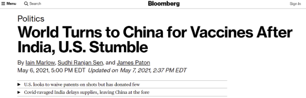 另據美國彭博社5月6日報道稱,世界上缺少新冠疫苗的國家越來越傾向向中國尋求幫助,盡管美國一直試圖強調自己的疫苗供應能力。