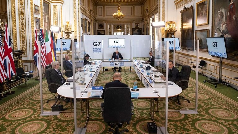 △七國集團外長會帶有透明隔斷的會議現(xiàn)場