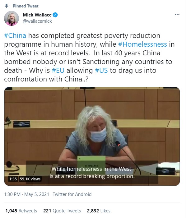 歐洲議會議員米克·華萊士(Mick Wallace)5月5日在議會發(fā)言時深入分析了中國“從來不侵略、從來不轟炸、從來不制裁別國”的和平發(fā)展歷程,痛斥了西方的劣勢發(fā)展基礎。