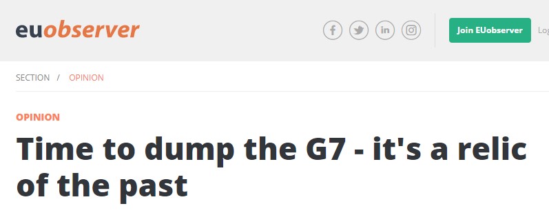 在G7外長會召開前夕,歐洲媒體《歐盟觀察者》(EU Observer)在其網(wǎng)站刊發(fā)評論文章《是時候拋棄G7了,它是歷史遺物》。