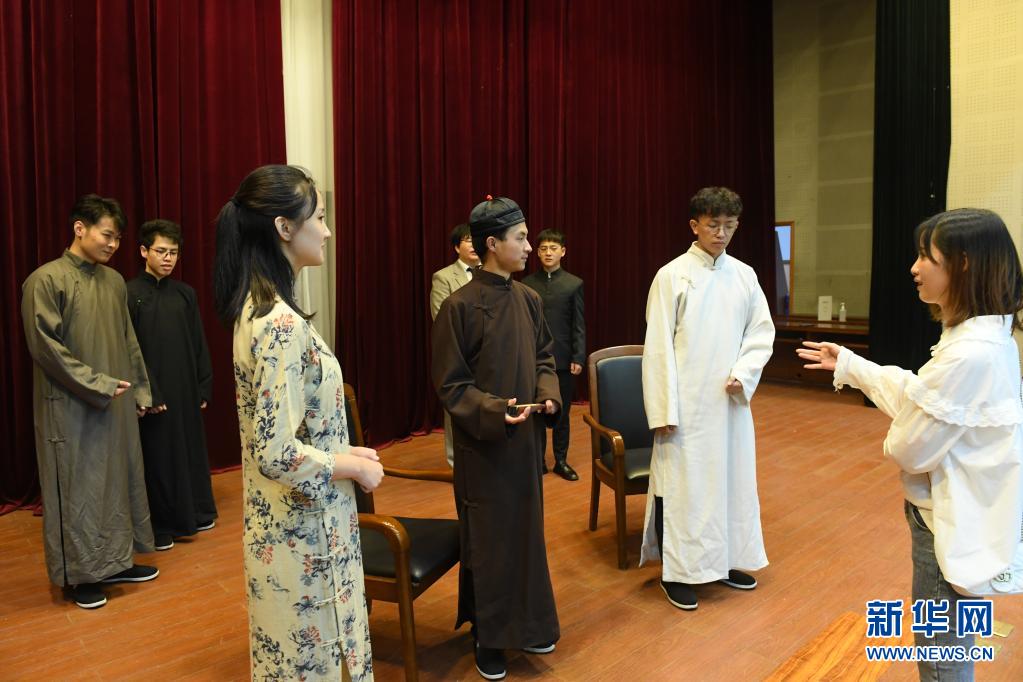 浙江嘉興學院紅船劇社的社員在學校排練話劇《初心》(2020年7月16日攝)。新華社記者 翁忻旸 攝