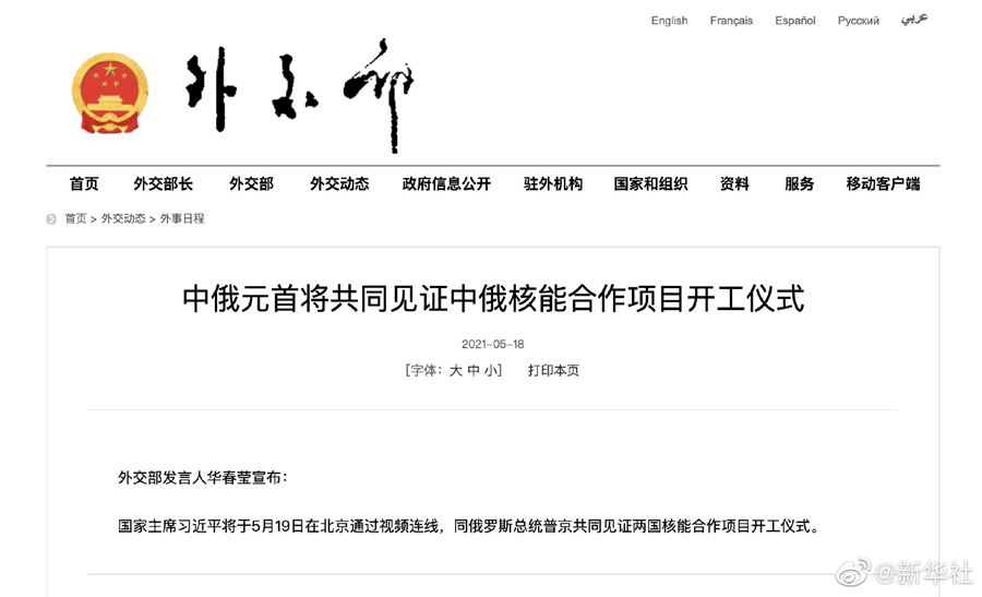 外交部發(fā)言人華春瑩5月18日宣布:國(guó)家主席習(xí)近平將于5月19日在北京通過視頻連線,同俄羅斯總統(tǒng)普京共同見證兩國(guó)核能合作項(xiàng)目開工儀式。