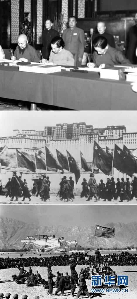 這是一張拼版照片:上圖為1951年5月23日,中央人民政府與西藏地方政府在北京簽訂《關于和平解放西藏辦法的協議》(簡稱“十七條協議”)。上圖為西藏地方政府代表在協議上簽字;中圖為1951年10月26日,西藏地方政府為人民解放軍舉行了隆重的入城式,拉薩古城飄揚著五星紅旗;下圖為西藏和平解放后,人民解放軍與藏族群眾在布達拉宮前歡度新年。