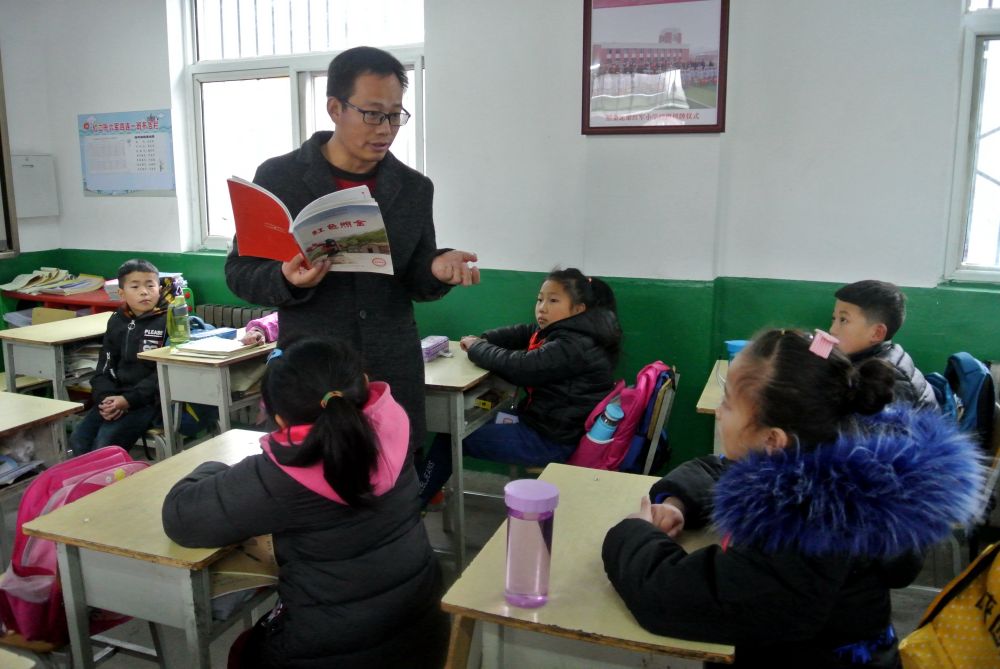 陜西省銅川市照金北梁紅軍小學副校長陶建剛給孩子們講《紅色照金》(2018年12月4日攝)。新華社記者 梁愛平 攝