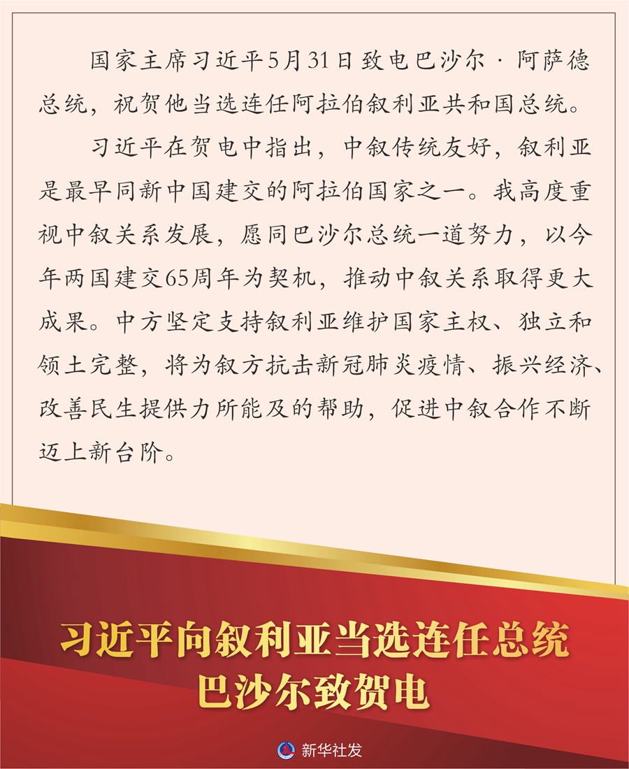 新華社北京6月1日電 國家主席習(xí)近平5月31日致電巴沙爾·阿薩德總統(tǒng),祝賀他當(dāng)選連任阿拉伯?dāng)⒗麃喒埠蛧偨y(tǒng)。