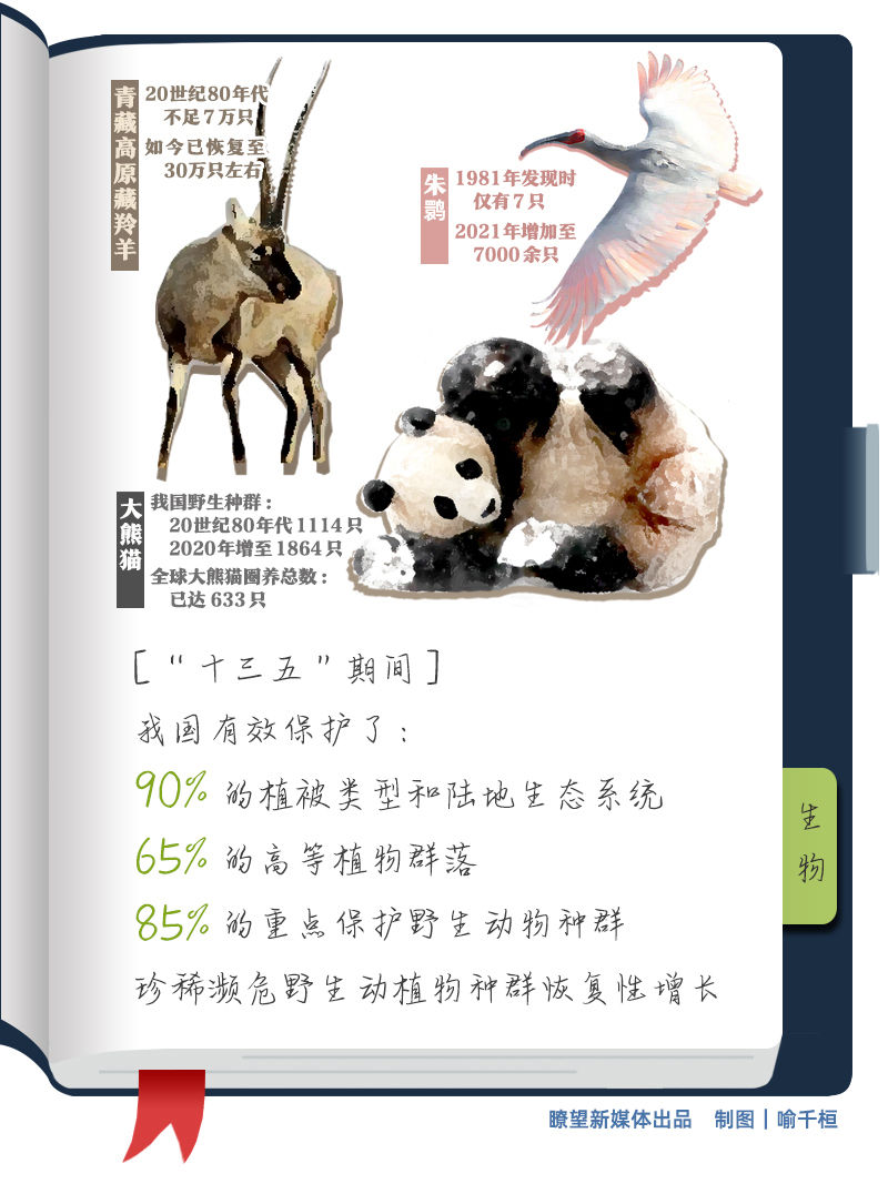 瀕危野生動植物保護不斷強化。“十三五”期間,我國有效保護了90%的植被類型和陸地生態系統、65%的高等植物群落,85%的重點保護野生動物種群,大熊貓、朱鹮、藏羚羊、蘇鐵等珍稀瀕危野生動植物種群實現恢復性增長。