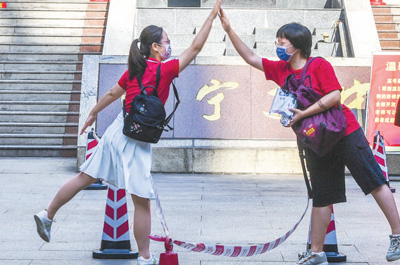 廣西南寧市第二中學新民校區考點,老師(左)與考生擊掌。