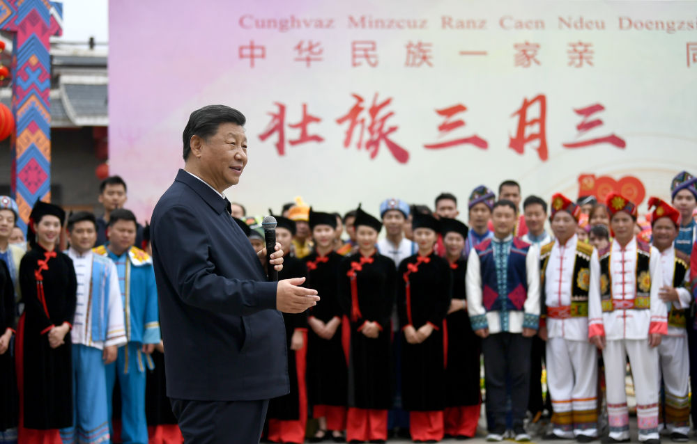 ↑2021年4月27日,習近平在南寧市廣西民族博物館外,同參加三月三“歌圩節”民族文化活動的各族群眾親切交流。
