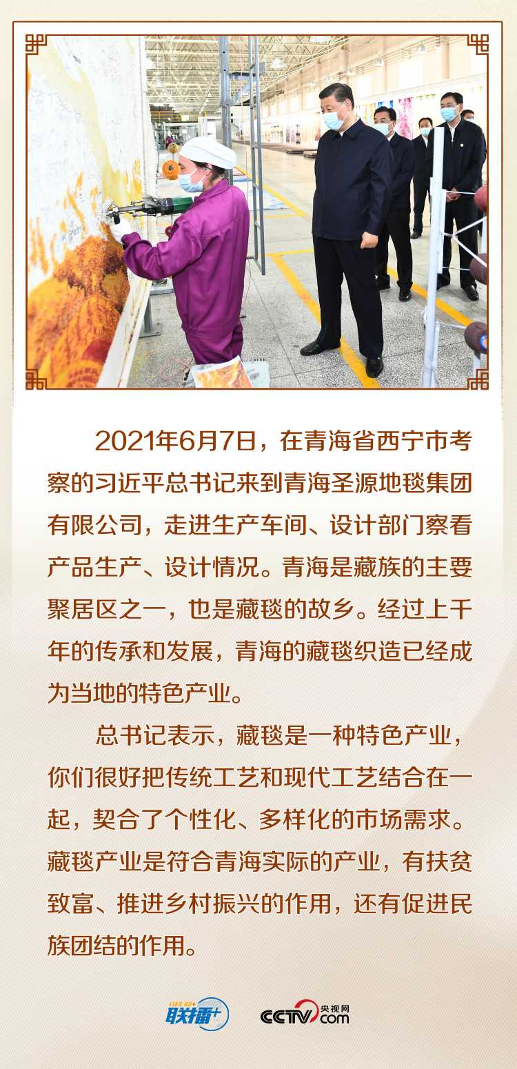 聯播+6月7日下午,在青海省西寧市考察的習近平總書記來到青海圣源地毯集團有限公司,走進生產車間、設計部門察看產品生產、設計情況。青海是藏族同胞的主要聚居區之一,也是藏毯的故鄉。經過上千年的傳承和發展,青海的藏毯織造已經成為當地的特色產業。在這里,總書記為藏毯織造這一傳統工藝點贊,并希望青海發展更多這樣的特色產業,靠創新實現更好發展。