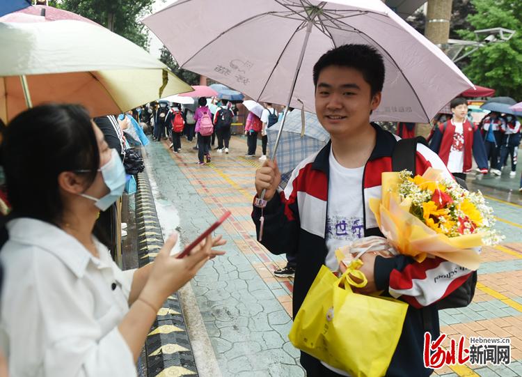 6月9日,河北師范大學(xué)附屬中學(xué)考點(diǎn)考生走出考場(chǎng),收到媽媽送上的鮮花。 河北日?qǐng)?bào)記者史晟全攝