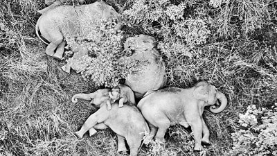 近日,一張由云南省森林消防總隊無人機監測任務分隊監測拍攝的照片走紅網絡,畫面中亞洲象群在昆明市晉寧區夕陽鄉賴家新村山林地里睡覺休息。云南省森林消防總隊供圖