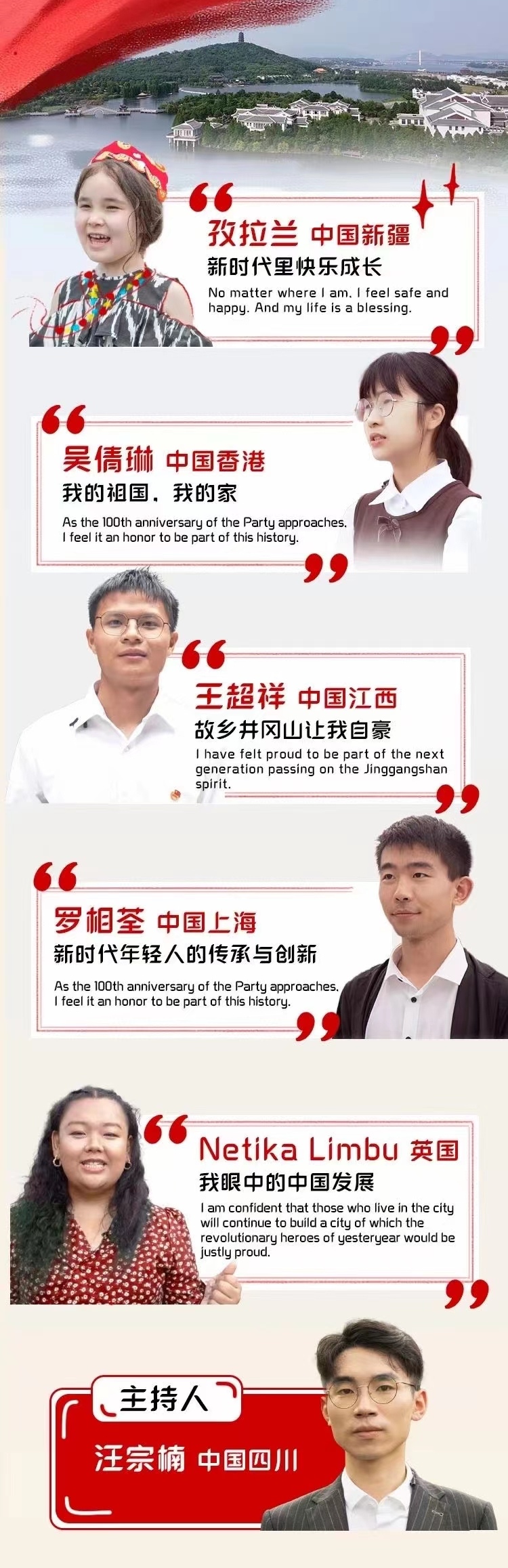 來自新疆伊犁的5歲小朋友孜拉蘭、中國香港的14歲中學生吳倩琳、江西吉安的17歲高中生王超祥、江西南昌的21歲大學生羅相荃、英國沃里克郡的23歲留學生內提卡·林布,分享了自己眼中新時代中國發展成就和中國共產黨百年歷程,以及青少年如何為國家和世界發展而奮斗的理想和情懷。
