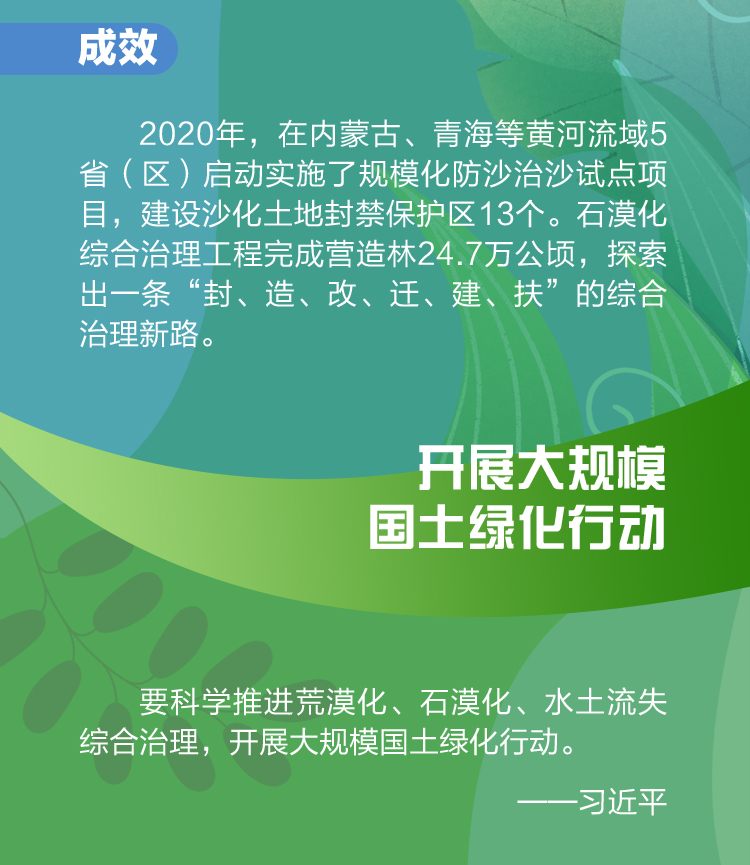 “人類只有一個地球家園。荒漠化防治是關系人類永續發展的偉大事業!秉h的十八大以來,各地區、各部門深入貫徹習近平生態文明思想,牢固樹立綠水青山就是金山銀山理念,統籌山水林田湖草沙系統治理,深入推進大規模國土綠化行動,國土綠化事業取得新進展新成效。
