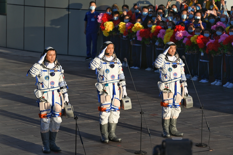6月17日,神舟十二號載人飛行任務航天員乘組出征儀式在酒泉衛星發射中心舉行。人民網記者 翁奇羽攝