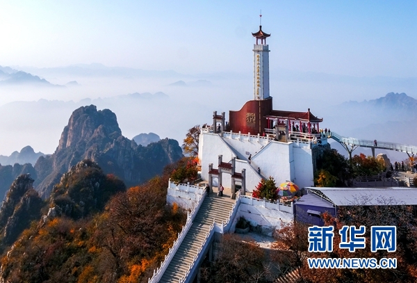 這是狼牙山棋盤陀峰頂的“狼牙山五勇士紀念塔”(2017年10月27日無人機拍攝)。新華社發