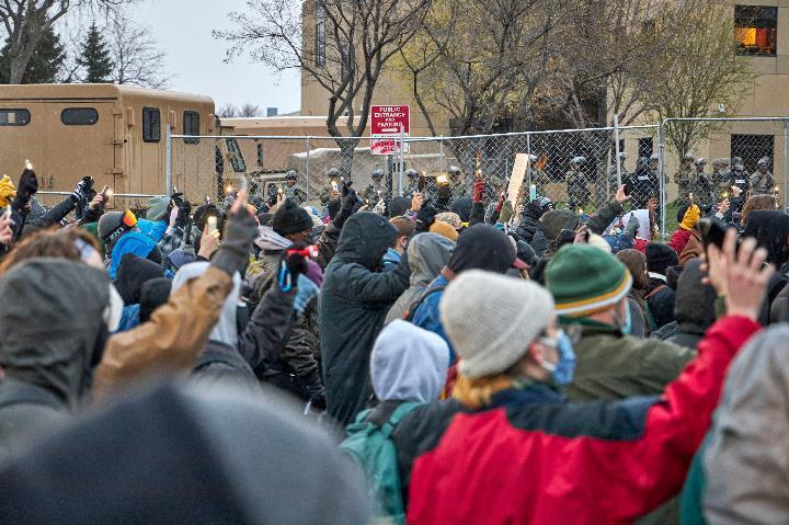 4月13日,人們在美國明尼蘇達州布魯克林森特市警察局外抗議。該市警察11日向一名非洲裔嫌疑人開槍并致死事件在當地引發持續抗議示威。(新華社發,馬修·麥金托什攝)