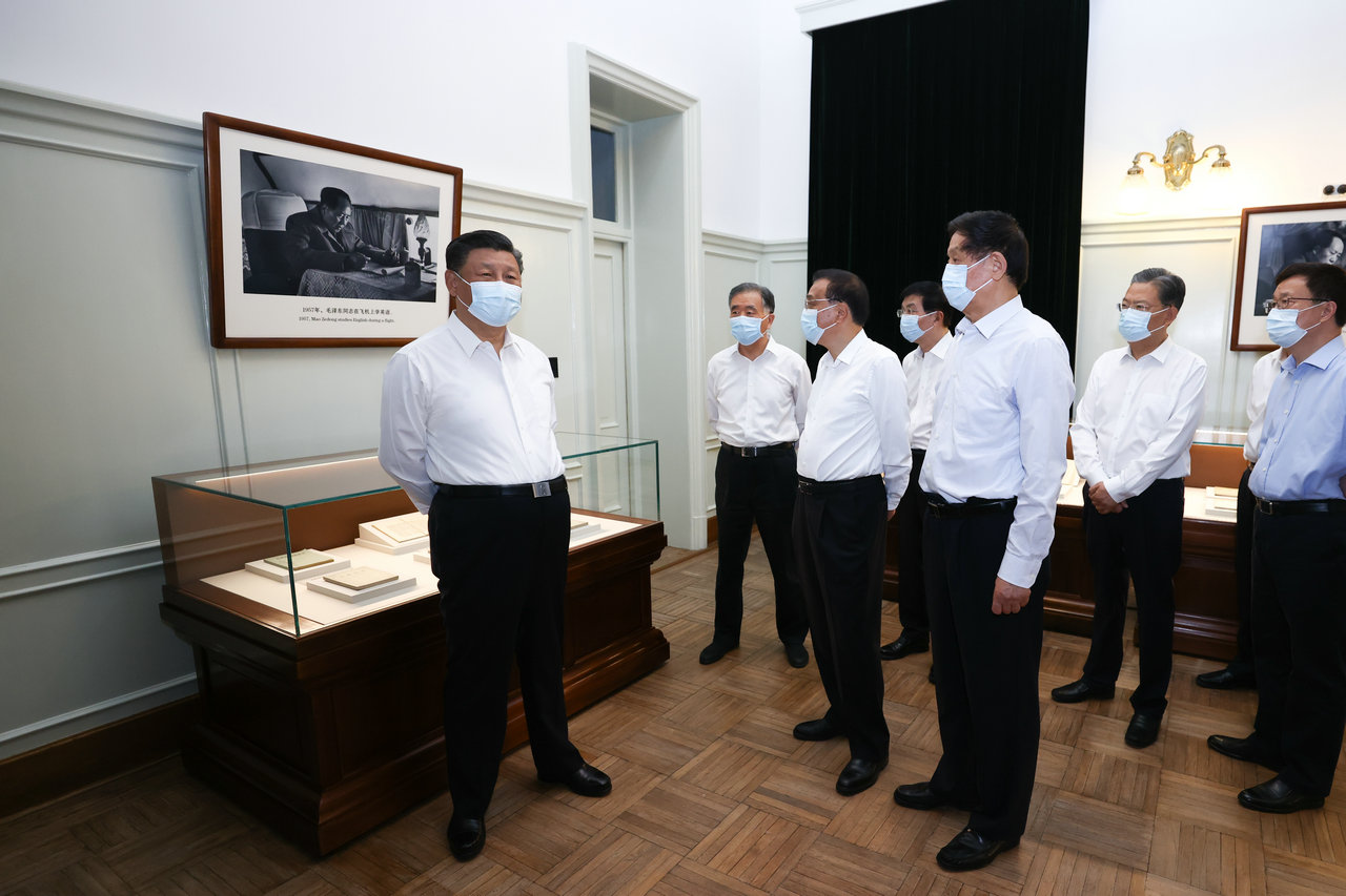豐澤園毛澤東同志故居,是毛澤東同志從1949年9月21日開始工作和生活了17年的地方。毛澤東同志在這里籌劃了新中國建立和建設的一系列大政方略。習近平帶領中央政治局同志來到這里參觀瞻仰,察看頤年堂大廳現場展陳,觀看毛澤東同志在豐澤園工作生活的影像短片,回顧毛澤東同志在這里主持召開的重要會議、作出的重大決策、會見的重要外賓,參觀毛澤東同志辦公區、會議室和藏書室,仔細察看毛澤東同志批改過的重要文件、閱讀過的書籍、穿過的衣物、使用過的日常用品和書信、手稿、照片等,追憶毛澤東同志的卓越功勛和崇高風范。習近平強調,北大紅樓和豐澤園在黨的歷史上都具有標志性意義,生動詮釋了中國共產黨是怎么來的、中華人民共和國是怎么來的,給我們上了一堂鮮活而又生動的黨史課。