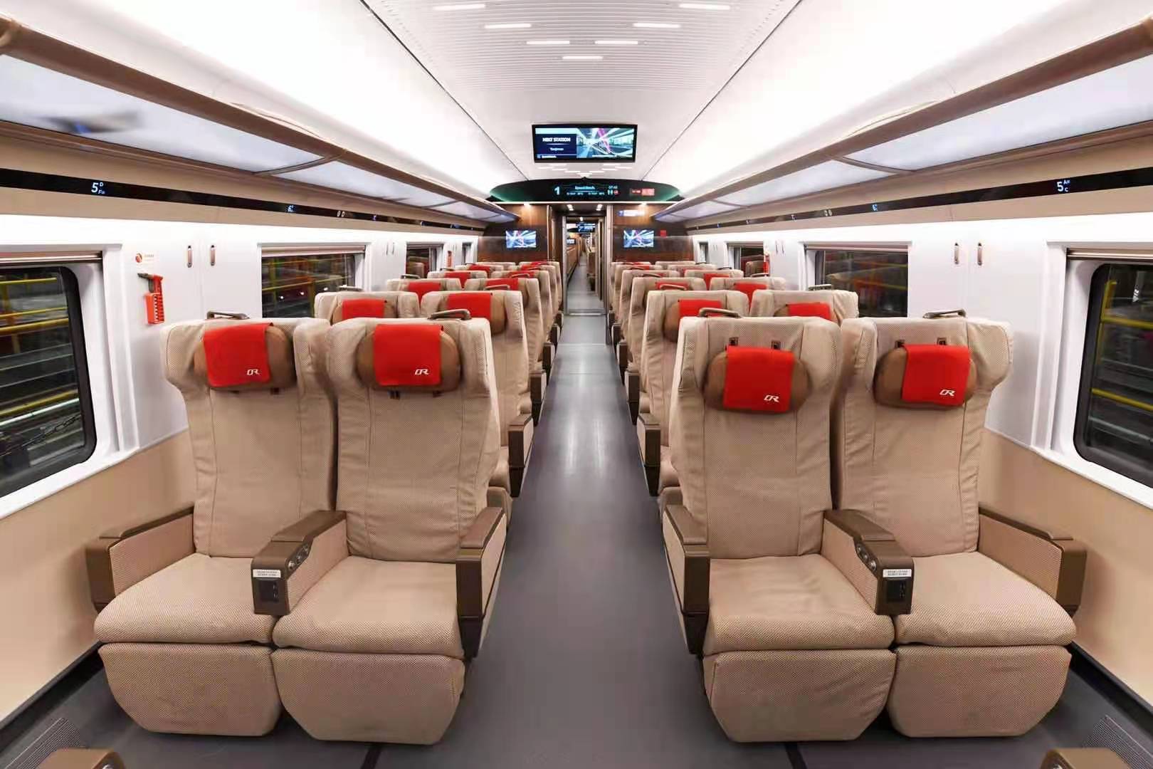 走進(jìn)車廂,雖然座椅布局沒有變化,但每個座椅都根據(jù)人體工程學(xué)進(jìn)行了優(yōu)化,乘坐更舒適。二等車廂的座椅除了保留以前座椅下方的充電設(shè)備,椅靠背上也增加了USB充電接口,小桌板杯托的凹槽加深,水杯放著更安全;一等座車廂,座椅增加了可調(diào)節(jié)頭靠、電動腿靠等;商務(wù)座車廂座椅交錯布置,還配備了支持手機(jī)投屏功能的智能交互終端,私密性、便捷性和舒適性都得到提升;無障礙車廂配備了更寬闊的通過門、無障礙衛(wèi)生間和輪椅放置區(qū)等。