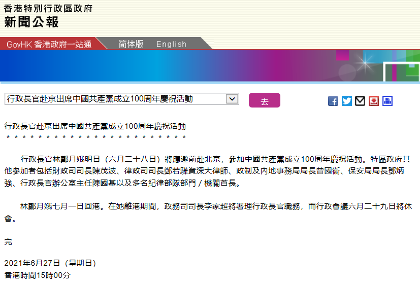 港府公報:林鄭月娥28日將赴京出席中國共產黨成立100周年慶;顒