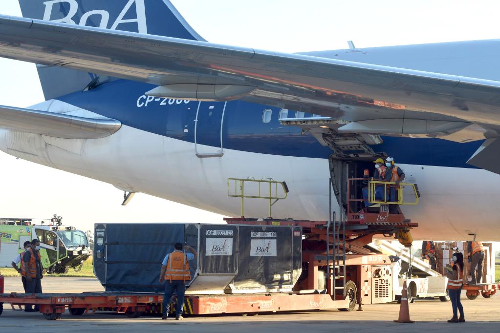 2月24日,運載中國新冠疫苗的玻航專機抵達玻利維亞第一大經濟城市圣克魯斯