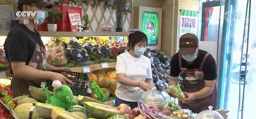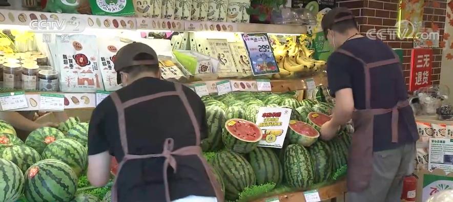 記者在北京一家水果連鎖門店看到,工作人員正在將剛剛采購的西瓜、葡萄、桃子等鮮果擺上貨架。負責人楊文鳳告訴記者,6月份至今,北方時令鮮果和南方熱帶水果均進入上市高峰期,水果供應數量充足、品種豐富。