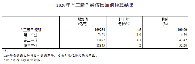 2020年,盡管受到突如其來的新冠肺炎疫情的巨大沖擊和嚴峻復(fù)雜國際形勢的影響,我國新產(chǎn)業(yè)新業(yè)態(tài)新商業(yè)模式仍繼續(xù)保持增長。經(jīng)核算,2020年我國“三新”經(jīng)濟增加值為169254億元,比上年增長4.5%(未扣除價格因素,下同),比同期國內(nèi)生產(chǎn)總值(GDP)現(xiàn)價增速高1.5個百分點;相當于GDP的比重為17.08%,比上年提高0.7個百分點。