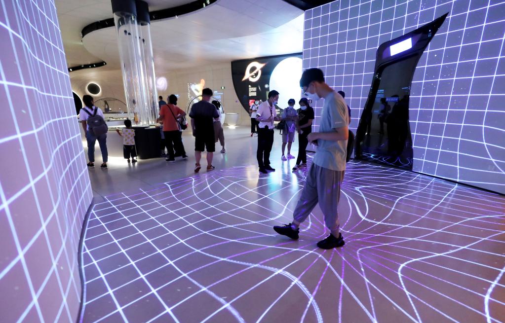 參觀者在體驗由投影裝置模擬的引力波。 新華社記者 方喆 攝