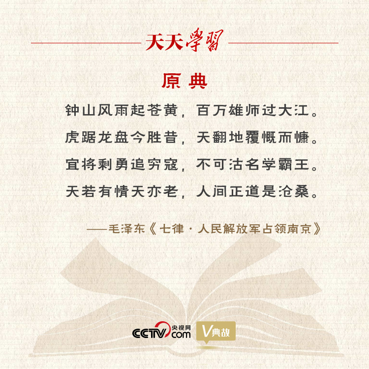 1949年4月21日,人民解放軍百萬(wàn)大軍橫渡長(zhǎng)江,4月23日一舉攻克國(guó)民黨盤(pán)踞22年的統(tǒng)治中心南京。毛澤東在北平西郊香山的雙清別墅得知消息后興奮異常,即興賦成《七律·人民解放軍占領(lǐng)南京》。其尾聯(lián)“天若有情天亦老,人間正道是滄桑”,包含毛澤東對(duì)歷史的慨嘆和思考。上句借用唐代詩(shī)人李賀《金銅仙人辭漢歌》的成句,意思是天是自然之物,然而長(zhǎng)期見(jiàn)證歷史變遷,也會(huì)對(duì)人類(lèi)社會(huì)翻天覆地的變化產(chǎn)生某種情感反應(yīng);下句對(duì)人間正在行進(jìn)著的歷史車(chē)輪無(wú)可阻擋的滄桑巨變,抒發(fā)無(wú)限感慨。