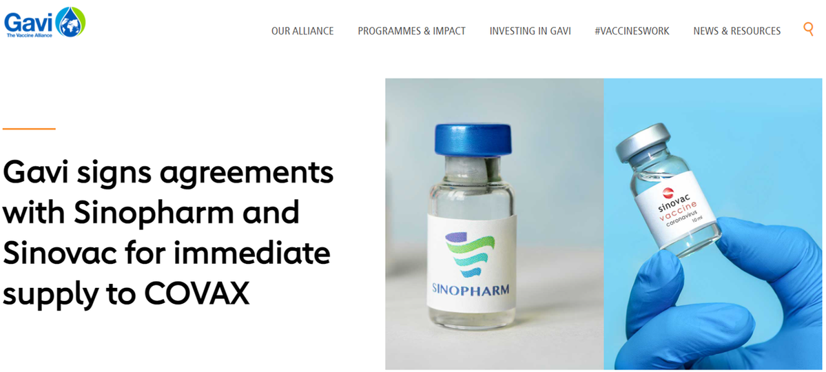 7月12日,疫苗聯盟全球免疫聯盟(Gavi)發布新聞公報稱,已與中國國藥集團和科興公司分別簽署了預購協議。