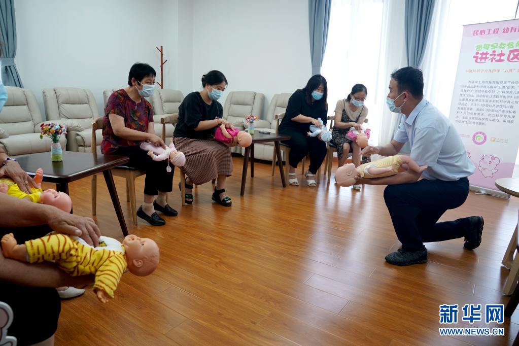 7月14日,在奉賢區(qū)奉浦街道秦塘生活驛站,醫(yī)生指導(dǎo)家長們學(xué)習(xí)小兒海姆立克急救法。