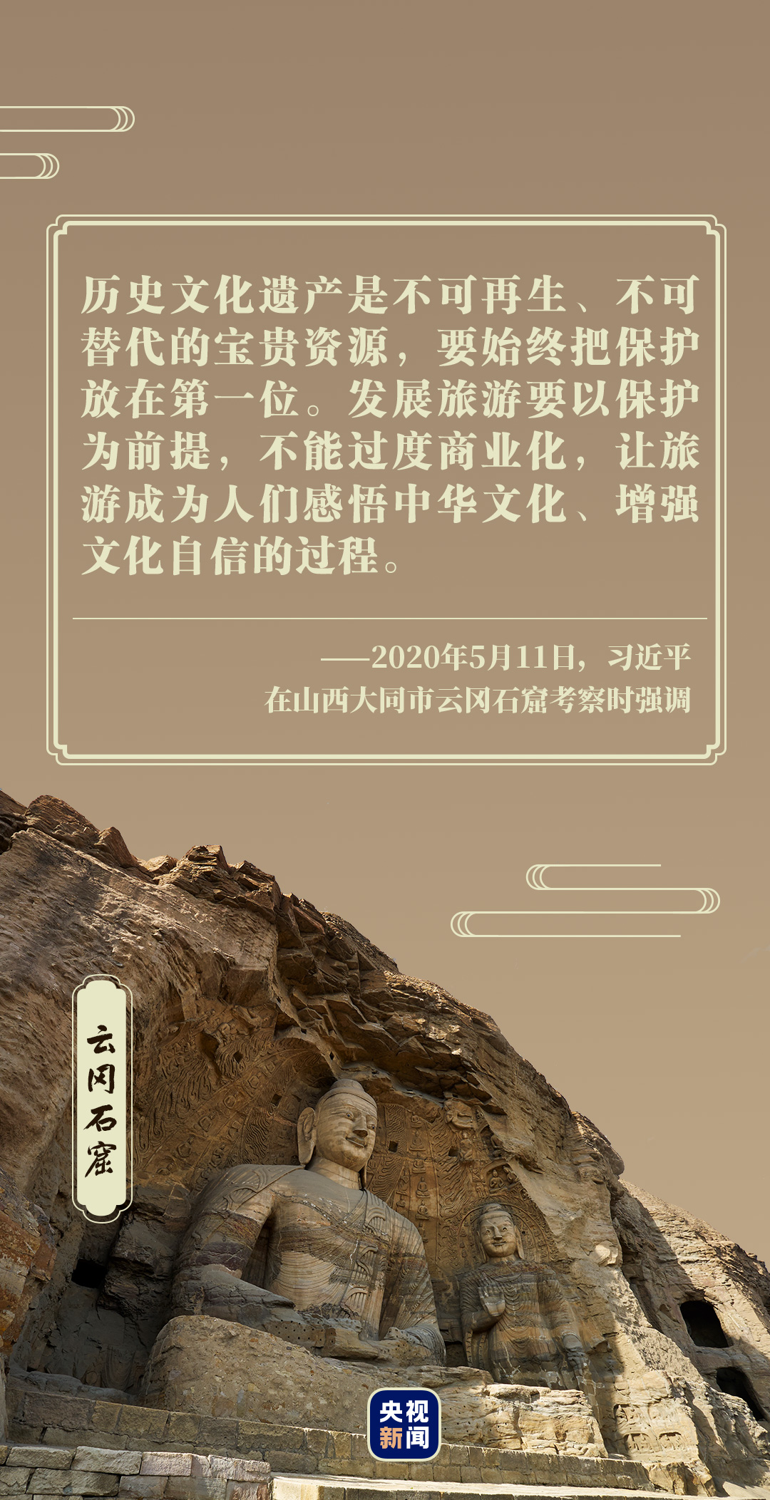 “要十分珍惜祖先留給我們的這份珍貴文化遺產,堅持保護優先的理念,加強石窟建筑、彩繪、壁畫的保護,運用先進科學技術提高保護水平,將這一世界文化遺產代代相傳。”