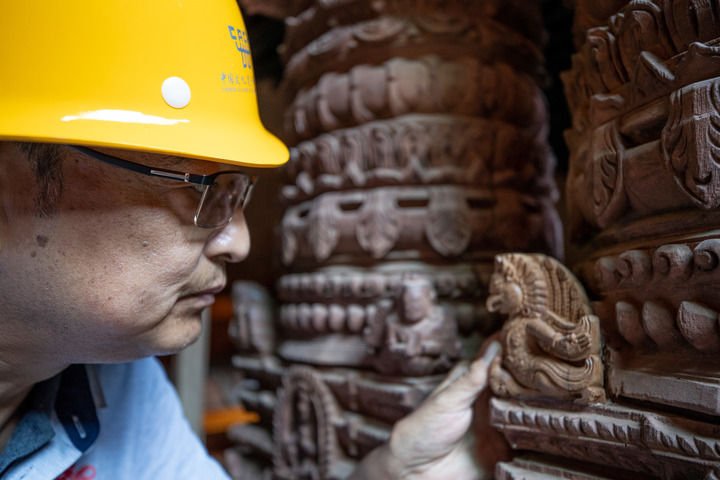 △2019年10月10日,在尼泊爾加德滿都杜巴廣場,中國派出的文物修復隊技術主管在九層神廟修復現場查看文物。