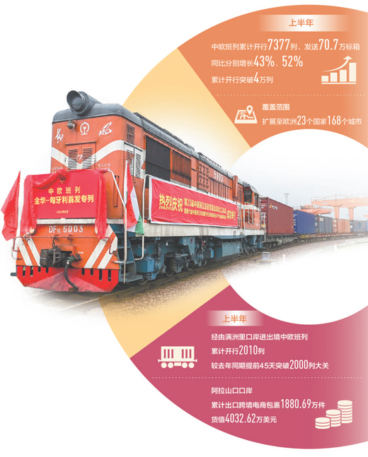 一個個不斷攀升的指標,反映出中歐班列的快速發展。中國國家鐵路集團有限公司的數據顯示,今年上半年,中歐班列累計開行7377列、發送70.7萬標箱,同比分別增長43%、52%,再創新高。