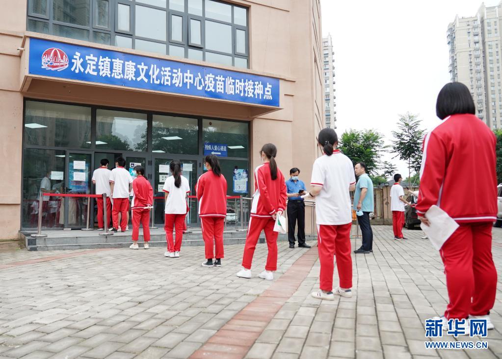 7月21日,來自首都師范大學附屬中學永定分校的學生在北京市門頭溝區永定鎮惠康文化活動中心疫苗臨時接種點排隊等候接種新冠病毒疫苗。