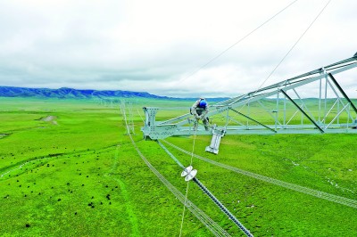 國網青海省電力檢修公司專業人員在青豫特高壓直流輸電線作業。新華社發