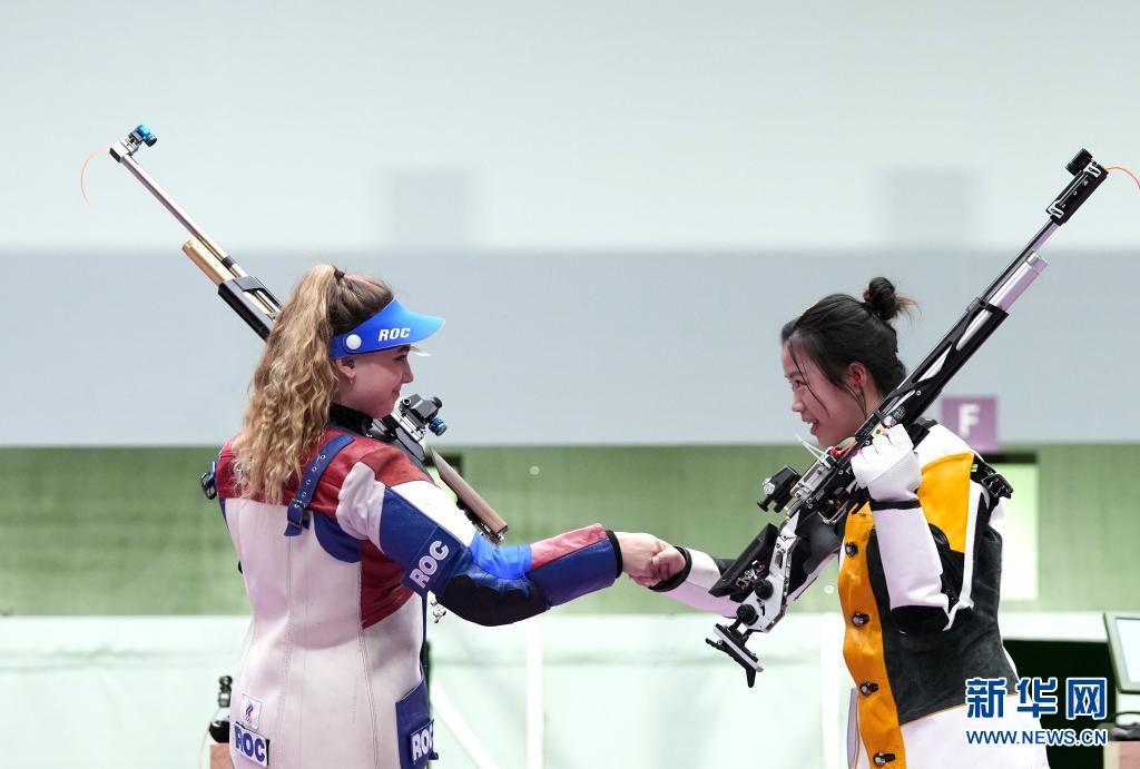 7月24日,楊倩(右)在賽后和亞軍俄羅斯運動員阿納斯塔西婭致意。