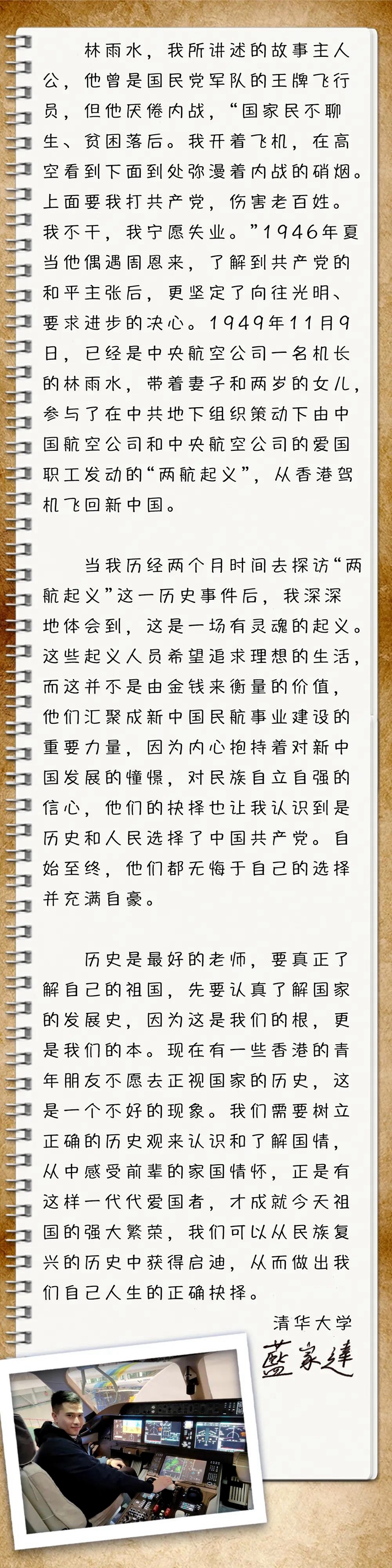 我叫藍家達,是一個土生土長的香港年輕人,現在在清華大學讀博士。我自小就很喜歡讀歷史,但“我的家我的國”節目組提出要探訪1949年在香港發生的“兩航起義”時,我卻一無所知。在北京的民航博物館,我看到了一張“兩航起義”人員的合影,大家臉上展露著燦爛自豪的笑顏,當中還有一個被抱在懷里的幼兒,她是誰?為什么她會和起義人員在一起?專家告訴我,這張合影背后是一段人心向背的故事。
