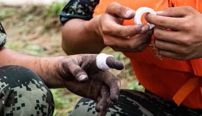 這是一雙抗洪一線武警指戰員的手,泥濘的雙手布滿新舊傷痕。在衛生員的一再請求下,他才停下,簡單包扎,又回到大堤上奔忙的隊伍中。