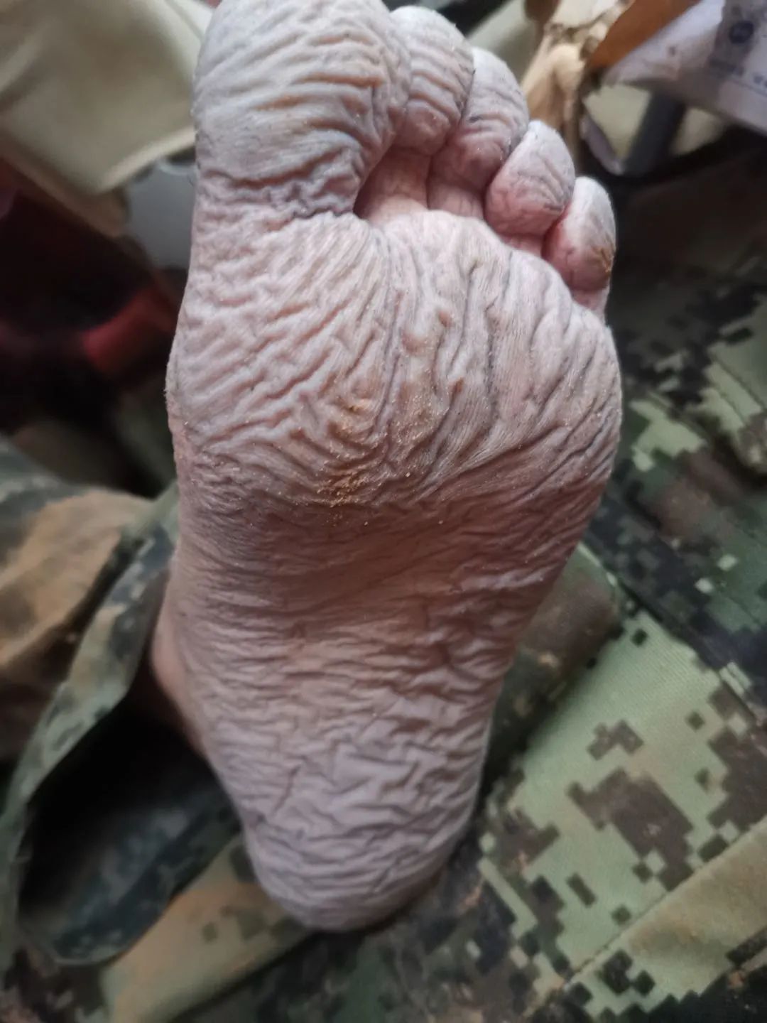 這是一雙在洪水中連續奮戰的老班長的腳,這雙腳被積水浸泡得發白、皸裂。