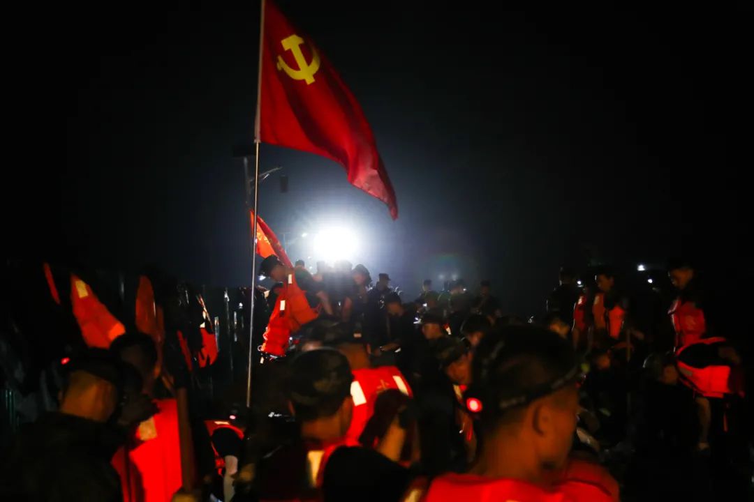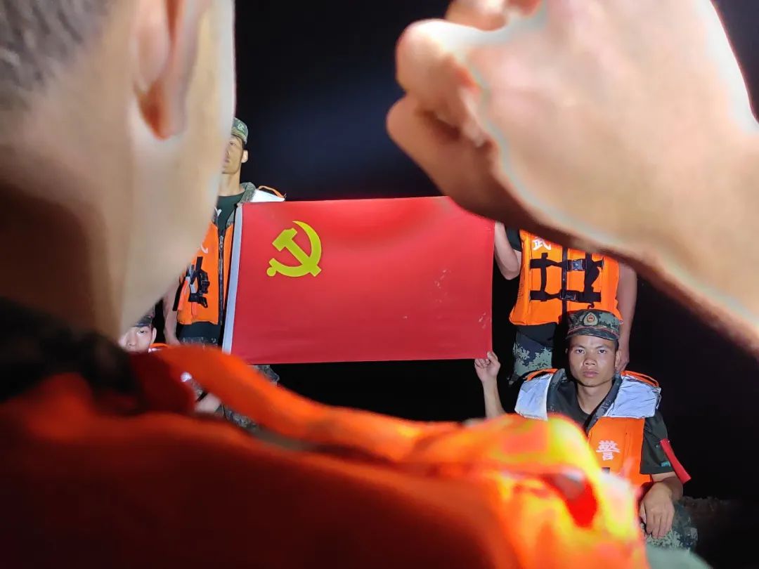 這是一場特殊的出征儀式?购榈拇蟮躺,面對鮮紅的黨旗,一群擔負突擊任務的官兵們,拳頭緊握,向黨宣誓,朝著洶涌的洪水,堅定地走去。