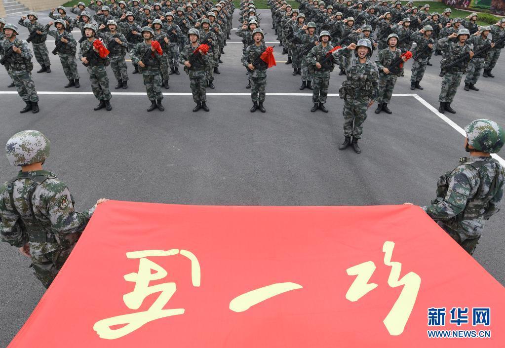 陸軍第83集團軍某旅“紅一連”為新戰士授槍后,全連官兵在連隊榮譽旗前宣誓(7月4日攝)。新華社記者 張永進 攝