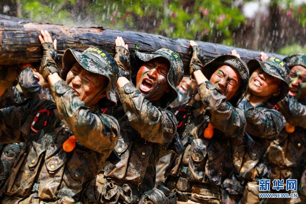 陸軍第83集團軍某旅“紅一連”戰士江詩意(左二)參加旅教導隊集訓(5月6日攝)。新華社發(姜東坡 攝)