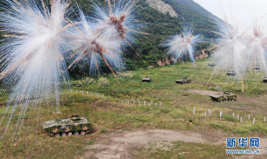 對抗演練中,陸軍第83集團軍某旅“紅一連”某型步戰車利用煙幕掩護,向“敵”陣地發起沖擊(7月4日攝)。新華社記者 張永進 攝