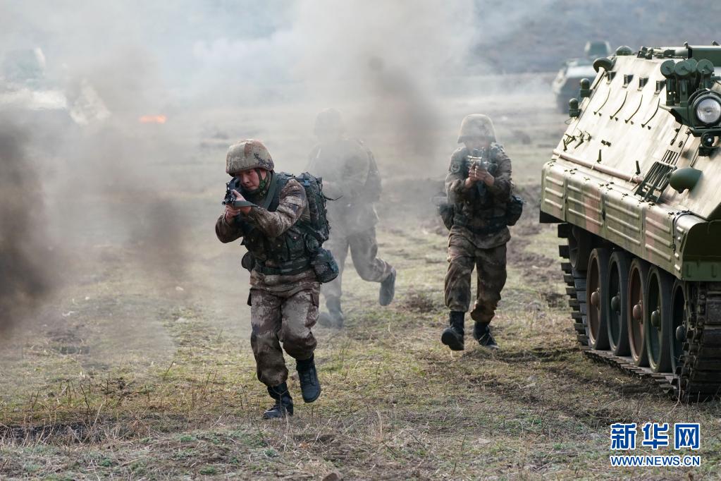 對抗演練中,陸軍第83集團軍某旅“紅一連”官兵下車戰斗(3月3日攝)。新華社記者 張永進 攝